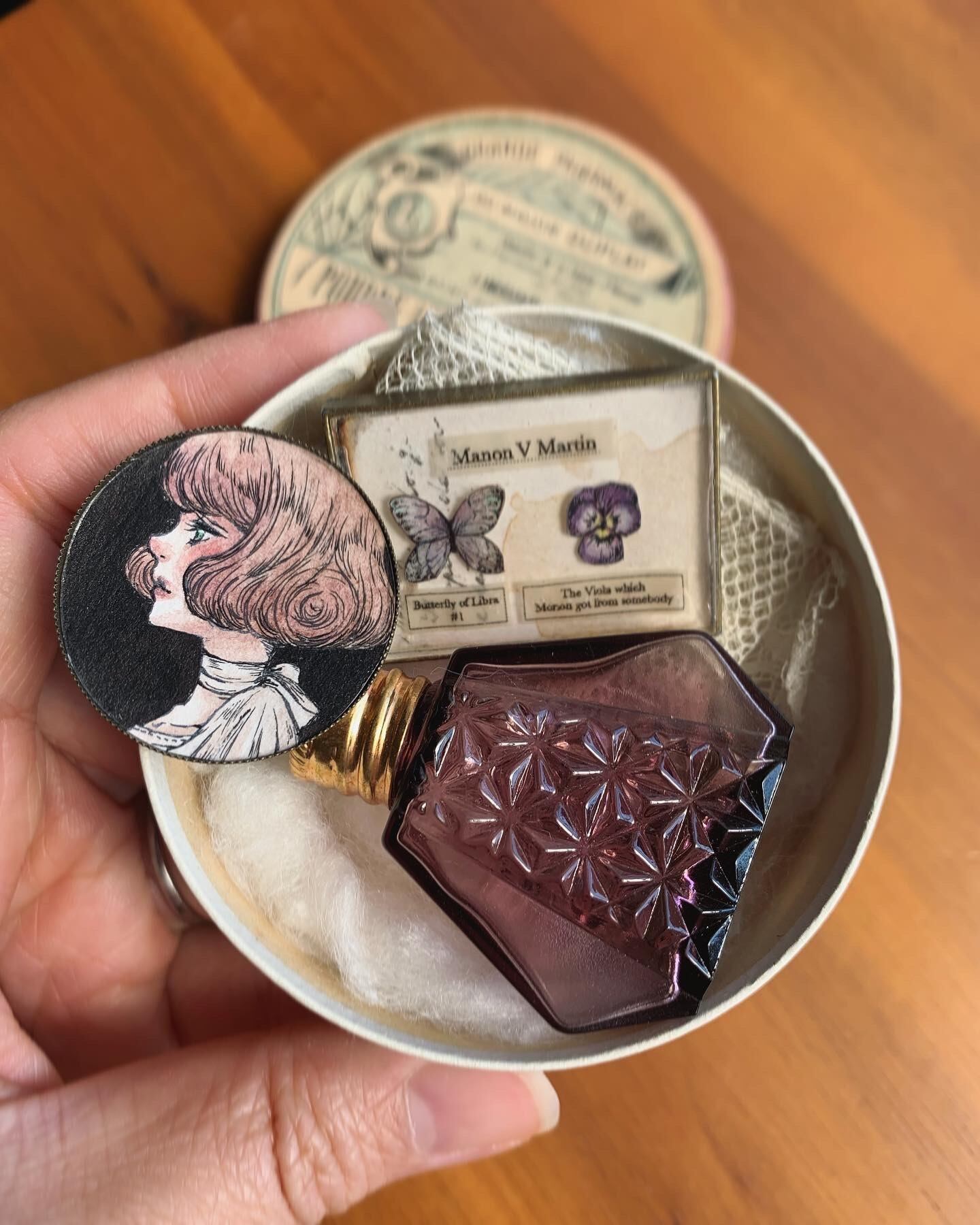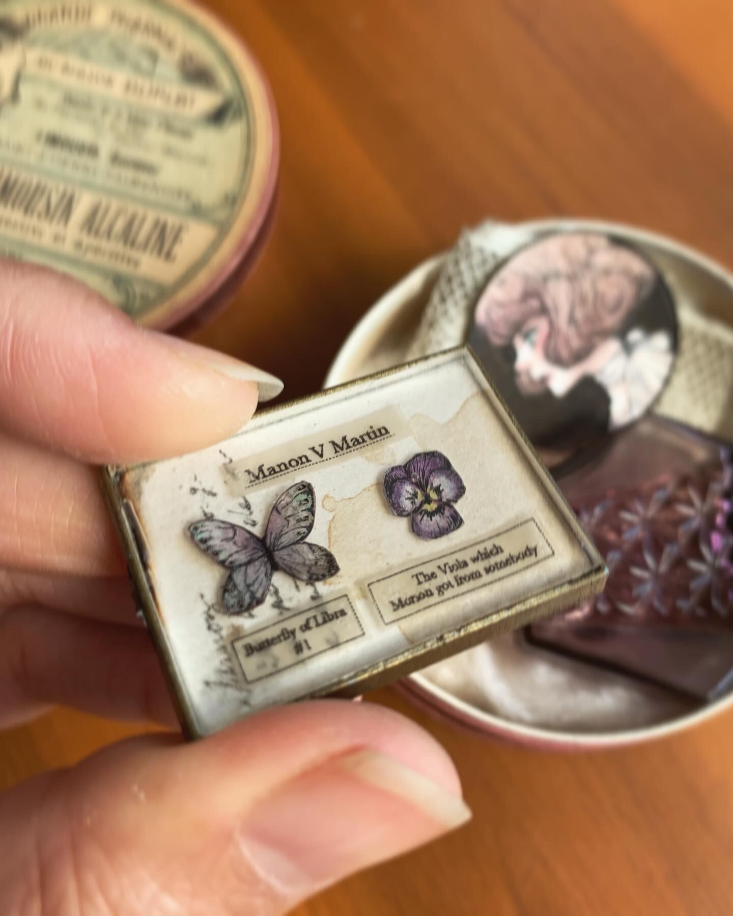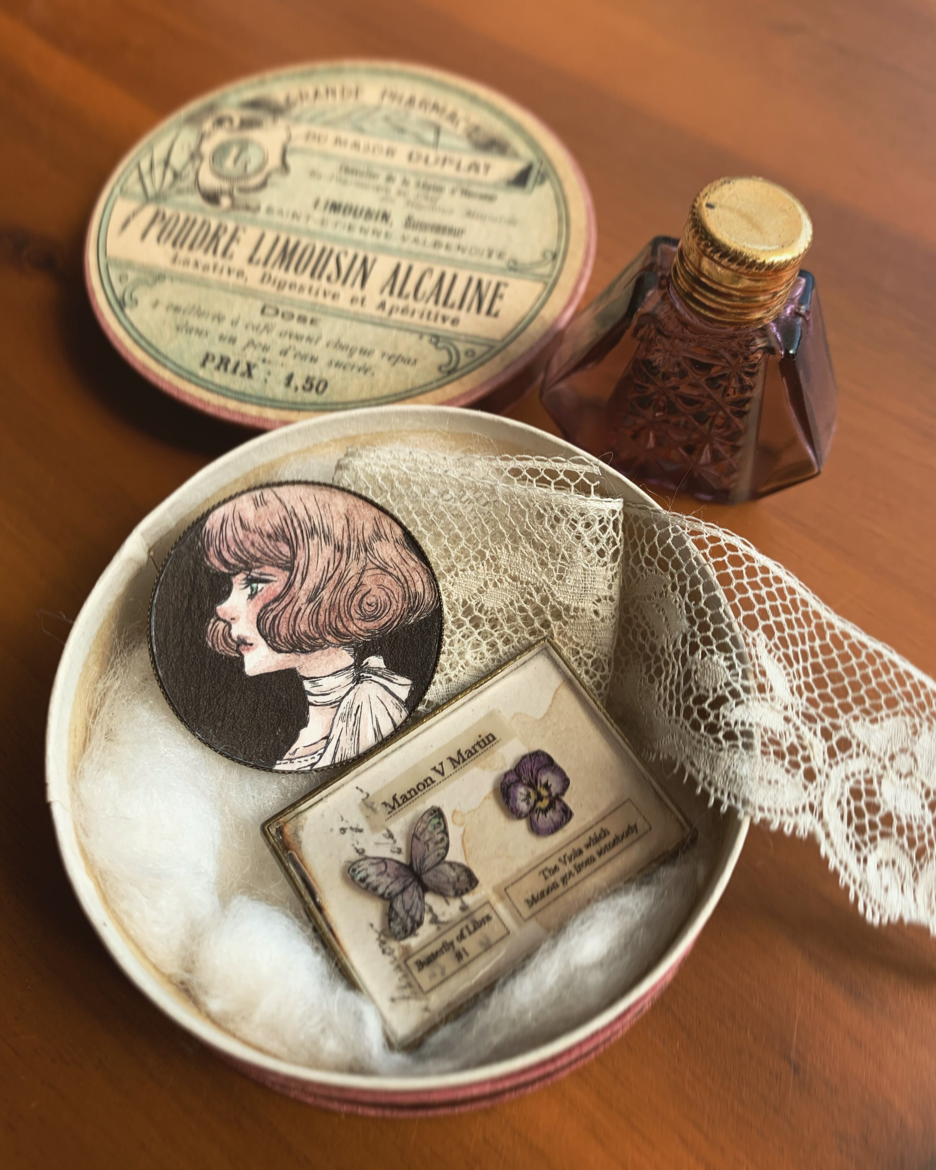 古い粉薬の箱に、少女の肖像画、蝶々の標本、アンティークレース、菫色の硝子の小瓶、ヴィンテージのラインストーンが入っています。